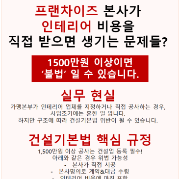 안녕하세요. 더함프랜차이즈개발원입니다. 요즘 프랜차이즈 창업 상담을 하다 보면, 본사가 인테리어 비용을 직접 받는 경우가 많습니다. 사실, 본사가 직접 받아도 법적으로 무조건 문제가 되는 건 아닙니다. 하지만! 일정 금액 이상을 받게 되면 ‘건설산업기본법(건설기본법)’ 위반이 될 수 있다는 점, 알고 계셨나요? 오늘은 프랜차이즈 본사의 인테리어비 수령 방식과 관련된 건설기본법 리스크에 대해 알아보겠습니다. 창업을 준비하시거나 프랜차이즈 시스템을 운영하시는 분들께 꼭 필요한 정보입니다. 저희는 가맹거래사로서 정보공개서, 가맹계약서 작성은 물론 프랜차이즈 등록까지 돕는 일을 하고 있습니다. 그러다 보니 인테리어, .......