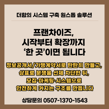 지금하시는 사업을 더 성장시키고 싶으신가요? 사장님만의 노하우를 더 많은 사람들과 공유하고 싶으신가요? 더함프랜차이즈개발원은 사장님의 성공을 더 큰 성공으로 새로운 가맹점의 시작도 성공으로 함께합니다. 작은 부분도 꼼꼼하게 잘 준비해야 추후에 분쟁없이 잘 성장할 수 있습니다. 정보공개서, 가맹계약서는 물론 프랜차이즈 브랜드 기획부터 시스템 구축, 마케팅,영업,분쟁조정등 가맹사업에서 겪는 모든 문제를 함께 지원, 해결하는 '프랜차이즈 컨설팅 전문회사' "더함프랜차이즈개발원" 프랜차이즈 사업의 올바른 시작은 정보공개서와 가맹계약서를 제대로 만드는 것입니다! 정보공개서, 가맹계약서는 프랜차.......